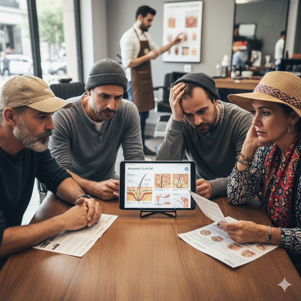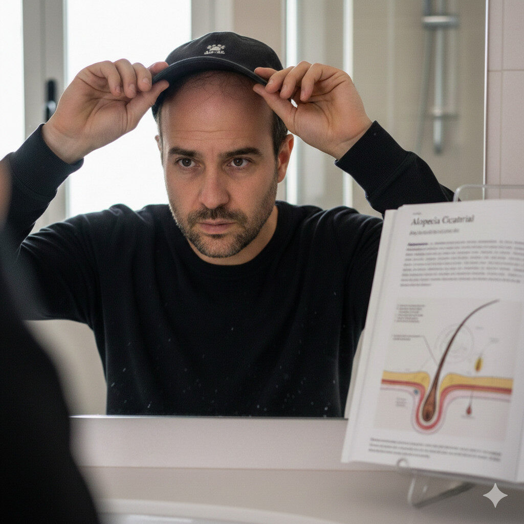 A diferencia de la alopecia androgénica (la calvicie común), donde el folículo se miniaturiza pero sigue vivo, la alopecia cicatricial es una emergencia capilar.
