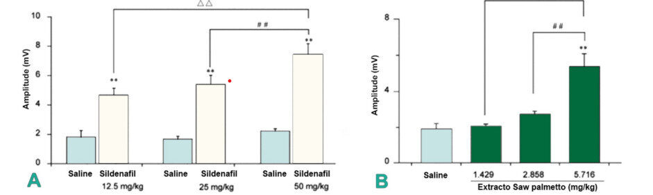 Figura VIII. Comparativa entre la respuesta eréctil del pene tras la administración de estimulación eléctrica tras la administración de diferentes dosis de sildenafil (A) y extracto de Saw Palmetto (B) en ratas.