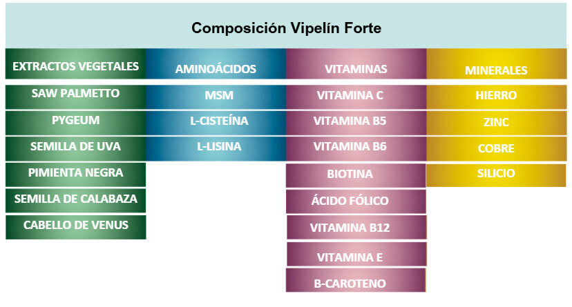 VIPELÍN Forte Man es un complemento nutricional eficaz en el tratamiento de la caída del cabello o alopecia masculina. Su fórmula única combina una selección de compuestos naturales y nutrientes esenciales cuyos principios activos actúan sinérgicamente para combatir las principales causas de la pérdida de cabello, ya se deban a factores nutricionales u hormonales.